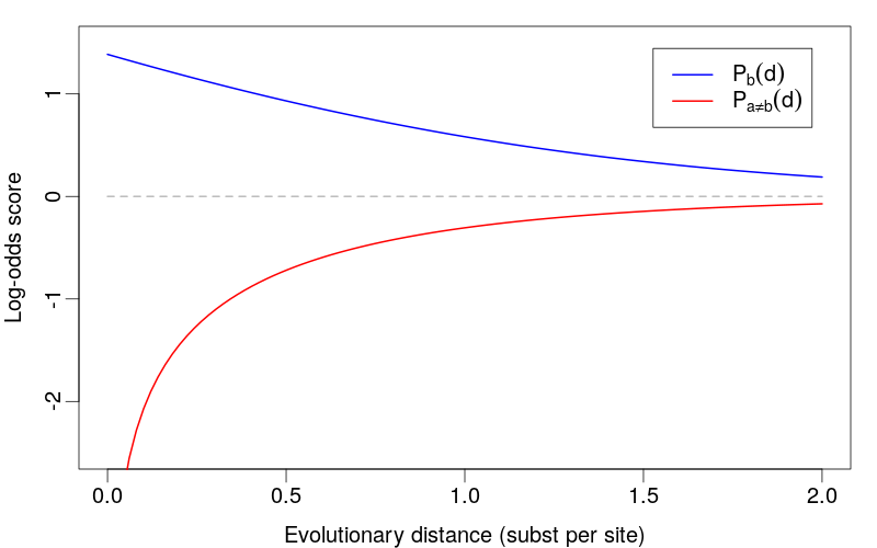 What we want to know is whether two sequences are homologous (evolutionarily related) or not, so we want an alignment score that reflects that. Theory says that if you want to compare two hypotheses, a good score is the log-odds score: the logarithm of the ratio of the likelihoods of your two hypotheses. If we assume that each aligned residue pair is statistically independent of the others (biologically dubious, but mathematically convenient), the alignment score is the sum of the individual log-odds score for each aligned residue pair.Sean R Eddy, Nature Biotechnology, 2004